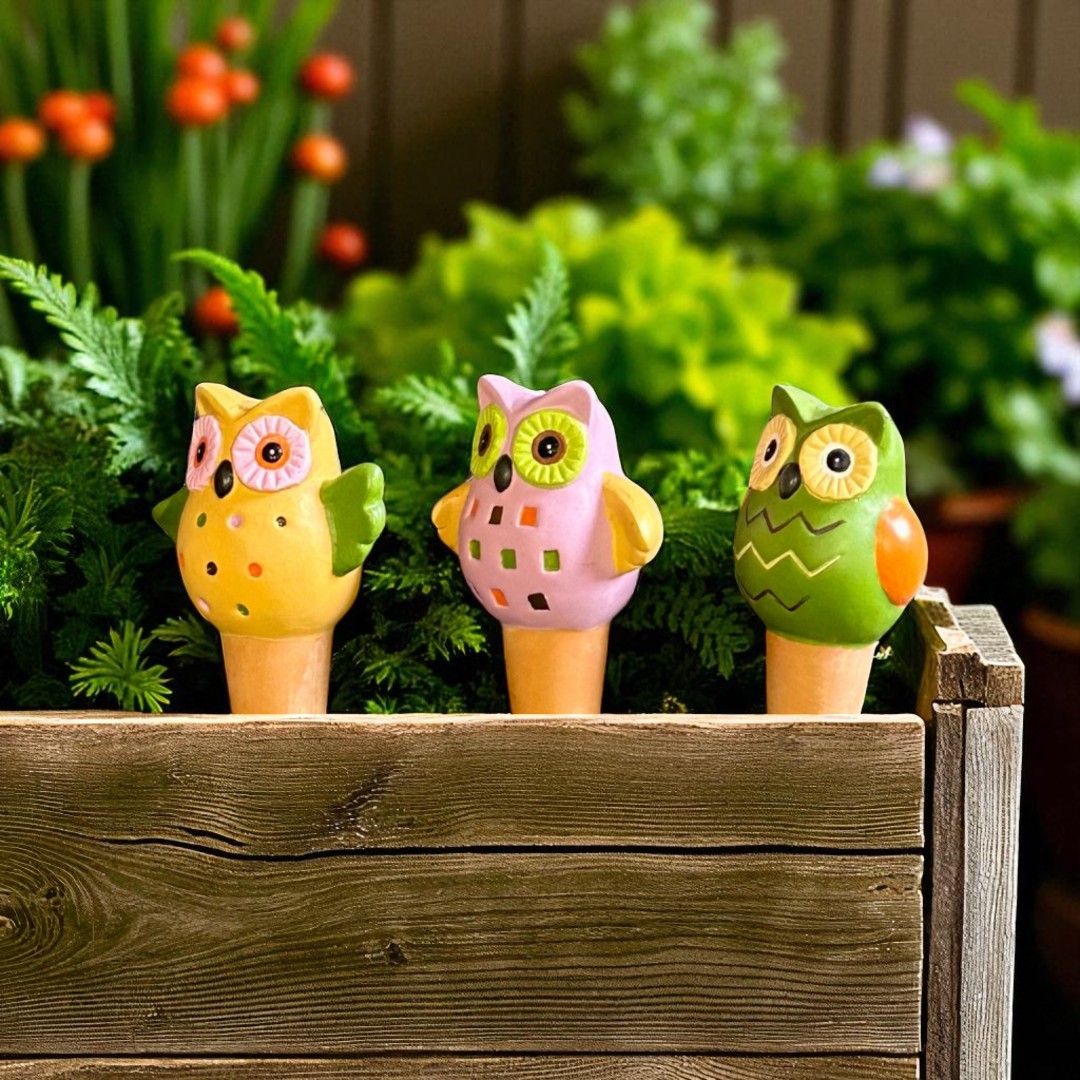 Add a touch of whimsy and functionality to your garden with this Set of 3 Owl Clay Watering Spikes. Each spike features a vibrant color—yellow, green, and pink—bringing a playful pop of color to your outdoor space. Designed with charming, expressive eyes, these cute owl-shaped spikes gently release water into your plants, helping to keep them hydrated. Not only practical but also a delightful decorative piece, these watering spikes make caring for your plants both fun and functional, while adding a touch of character to your garden or patio.