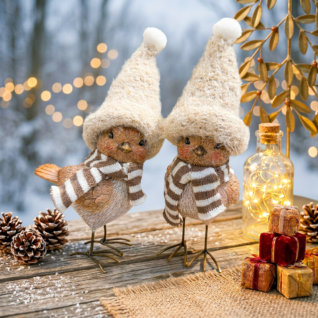 These charming Christmas birds bring a cosy, whimsical touch to any festive display. With their tall fuzzy hats, striped scarves, and textured bodies, they add personality and gentle humour to shelves, mantels, and tabletop scenes. A delightful pair that instantly warms the room with holiday cheer.