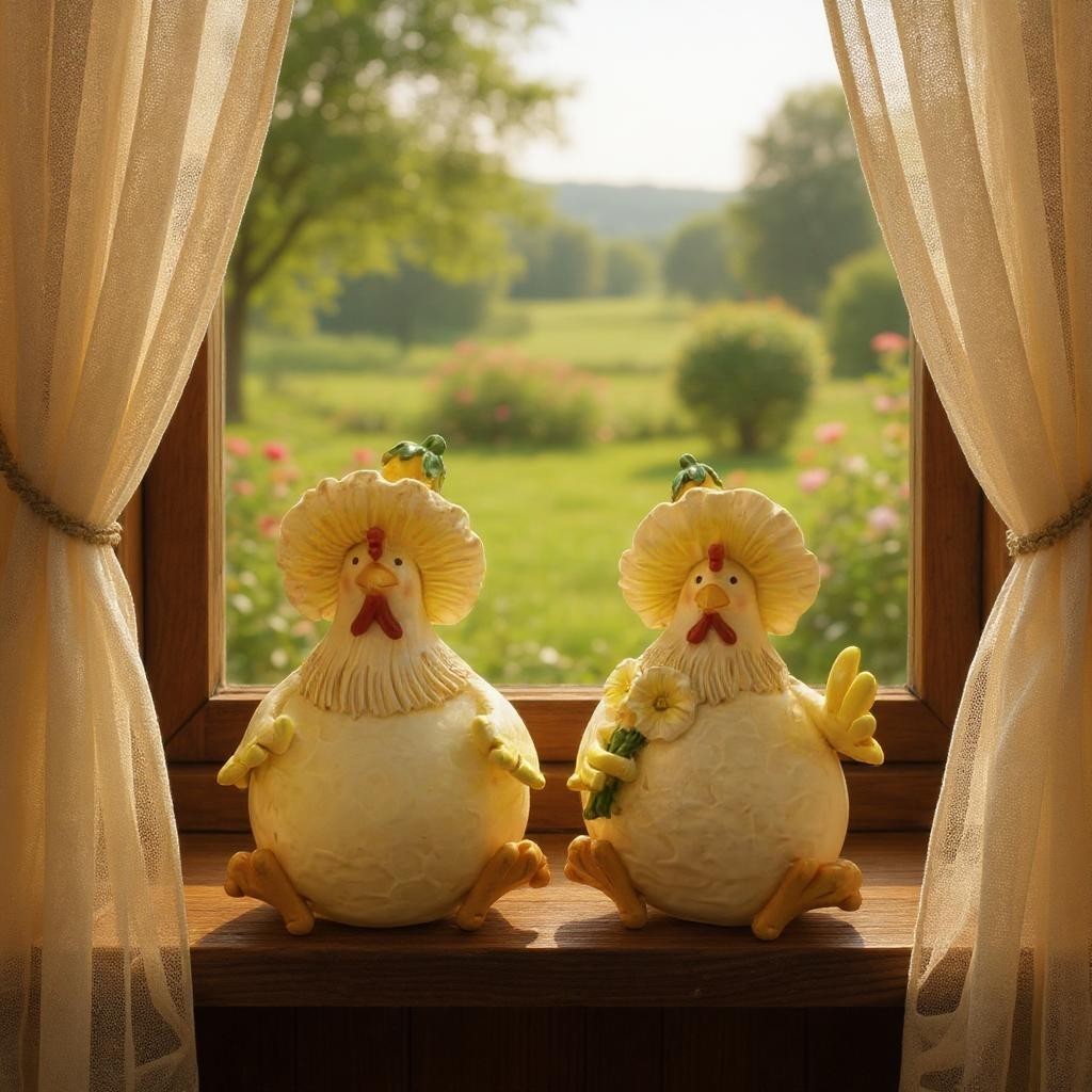 Brighten your home or garden with this cheerful chicken pair. With vivid red combs, sunny yellow feet, and spring blossoms in hand, they radiate charm and playfulness. Whether perched on a shelf or nestled among flowers, these hens bring a joyful burst of colour and character to any setting.
