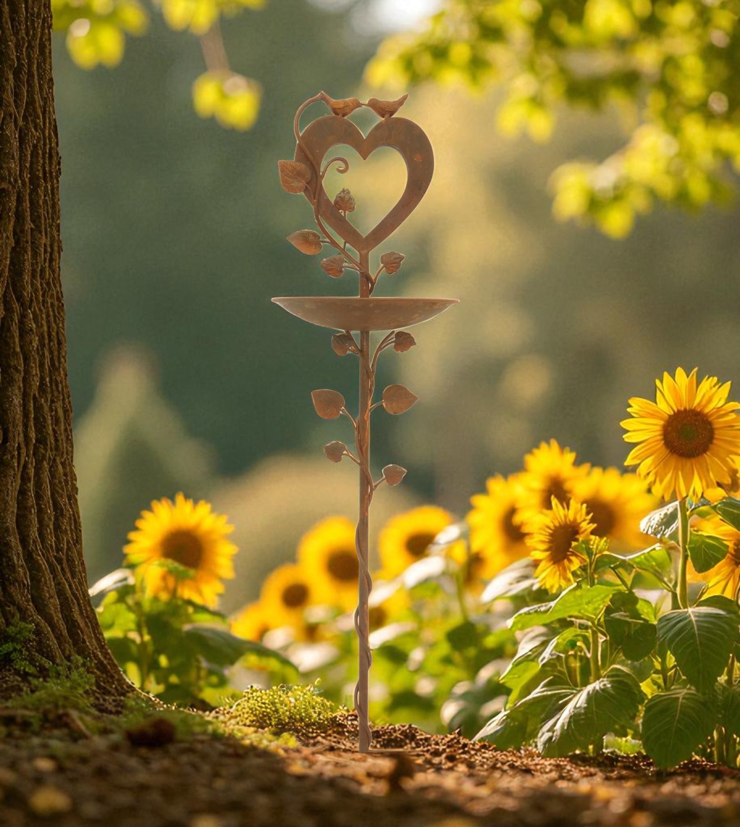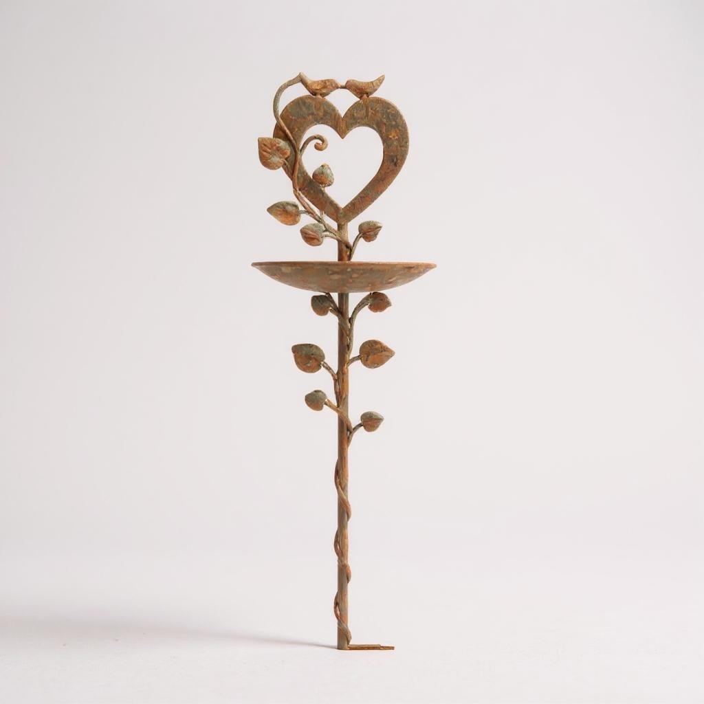 A tender blend of charm and function, this metal garden stake features a heart adorned with perched birds, leafy vines, and a shallow bowl for treats. Finished in antique tones, it brings warmth and welcome to your outdoor space.